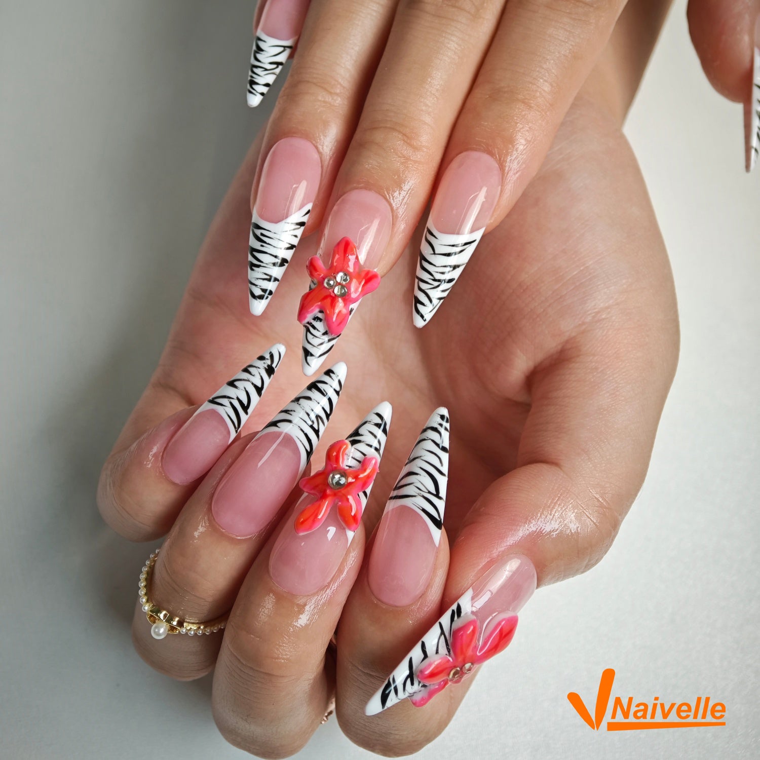 💅 Press on nails with zebra print French tips, 3D red flowers, and rhinestone accents. Bold yet feminine design.