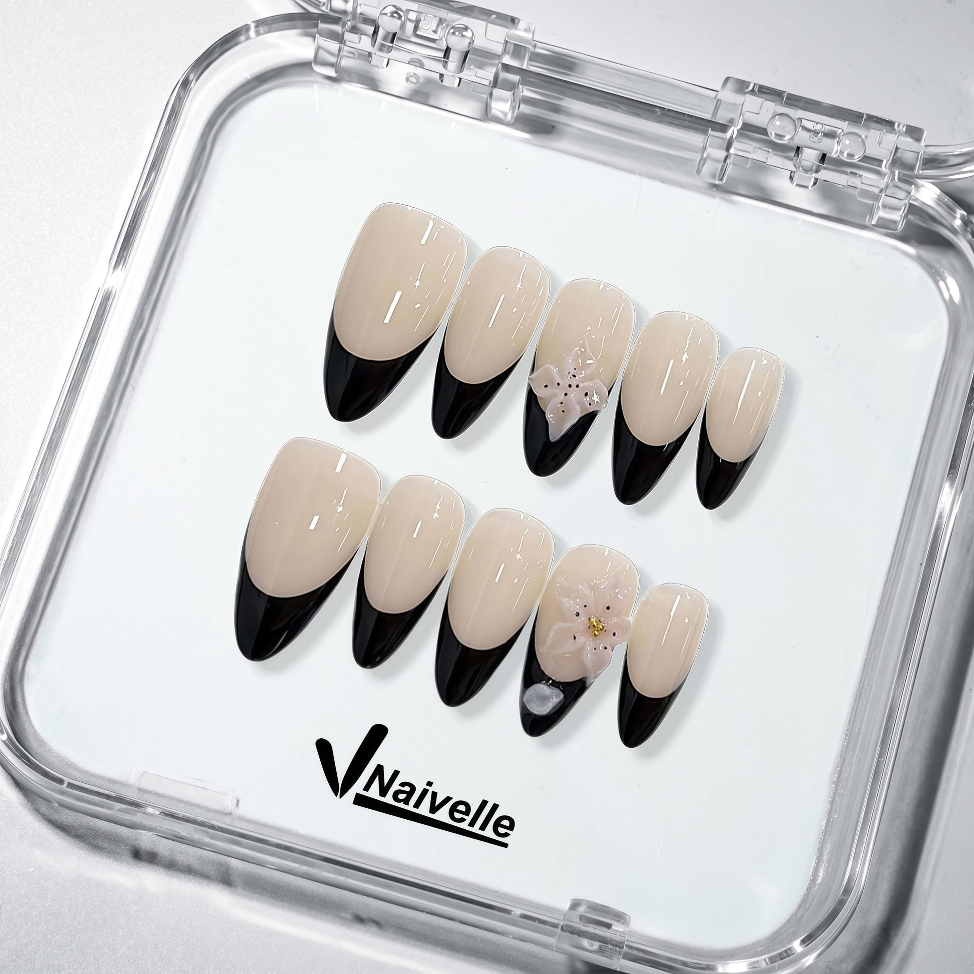 💅 Chic and sophisticated with a striking black tip and soft beige base, complemented by delicate white floral accents for a perfect blend of bold and feminine.