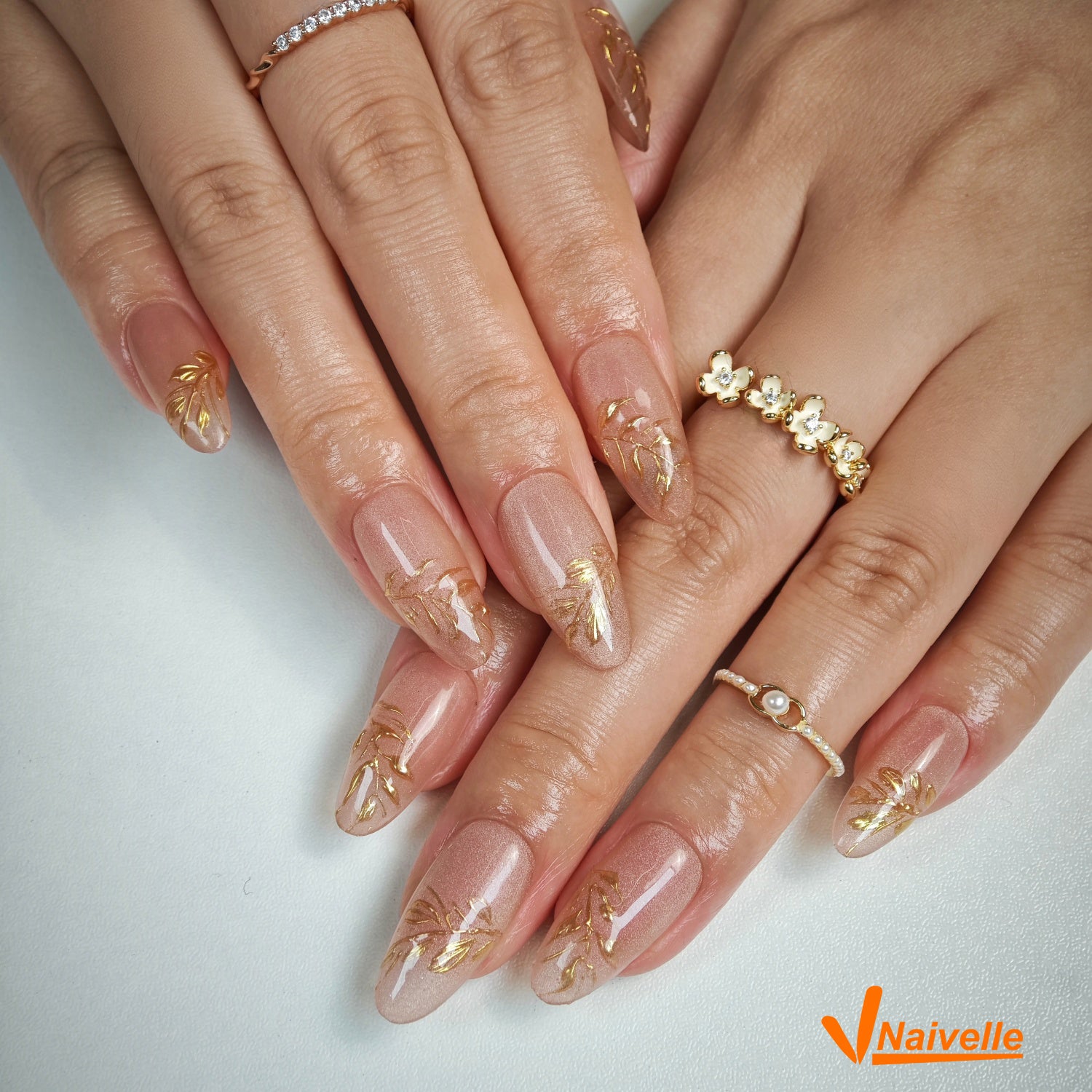 💅 Minimalist press on nails featuring delicate gold leaf patterns on a soft nude base. A chic and timeless look with glossy finish that blends elegance with subtle luxury.
