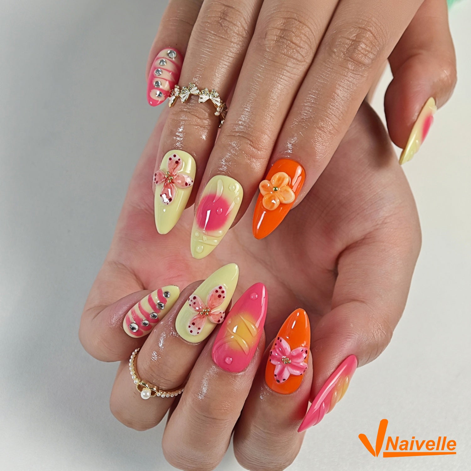 💅 Press on nails with ombré gradients, 3D flowers, butterfly accents, and rhinestones. Bright and playful style.