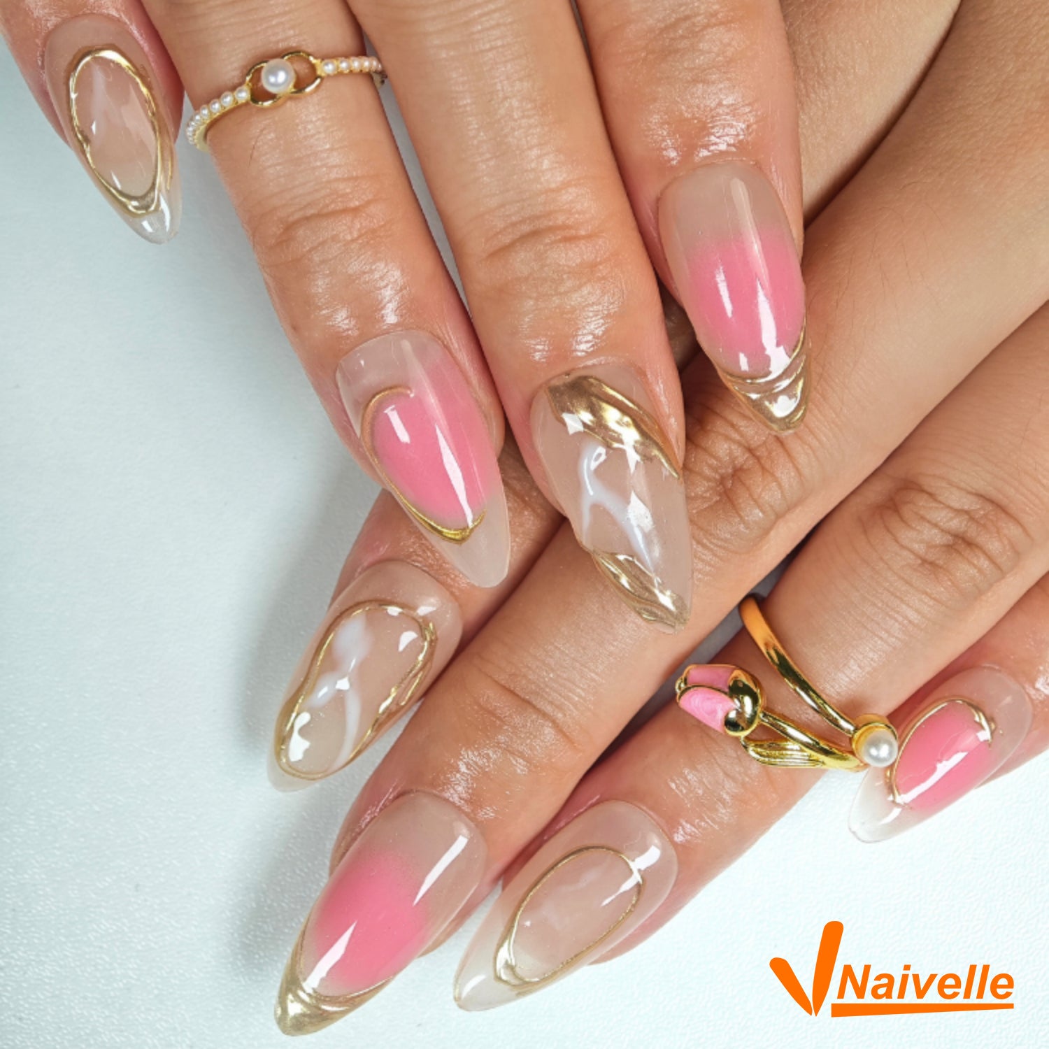 💅 Press on nails with pink ombré, marble textures, and metallic gold outline. Modern and elegant glossy style.