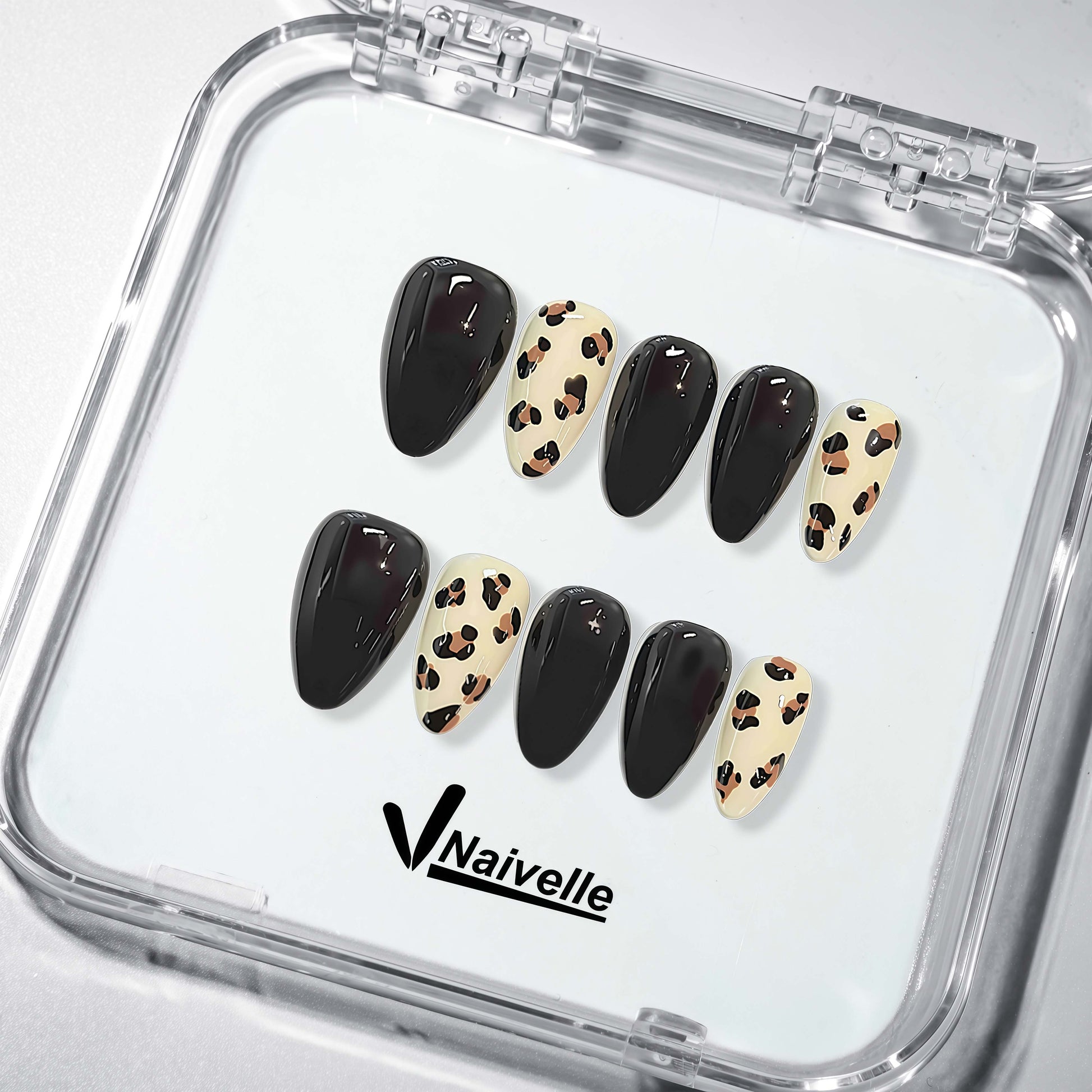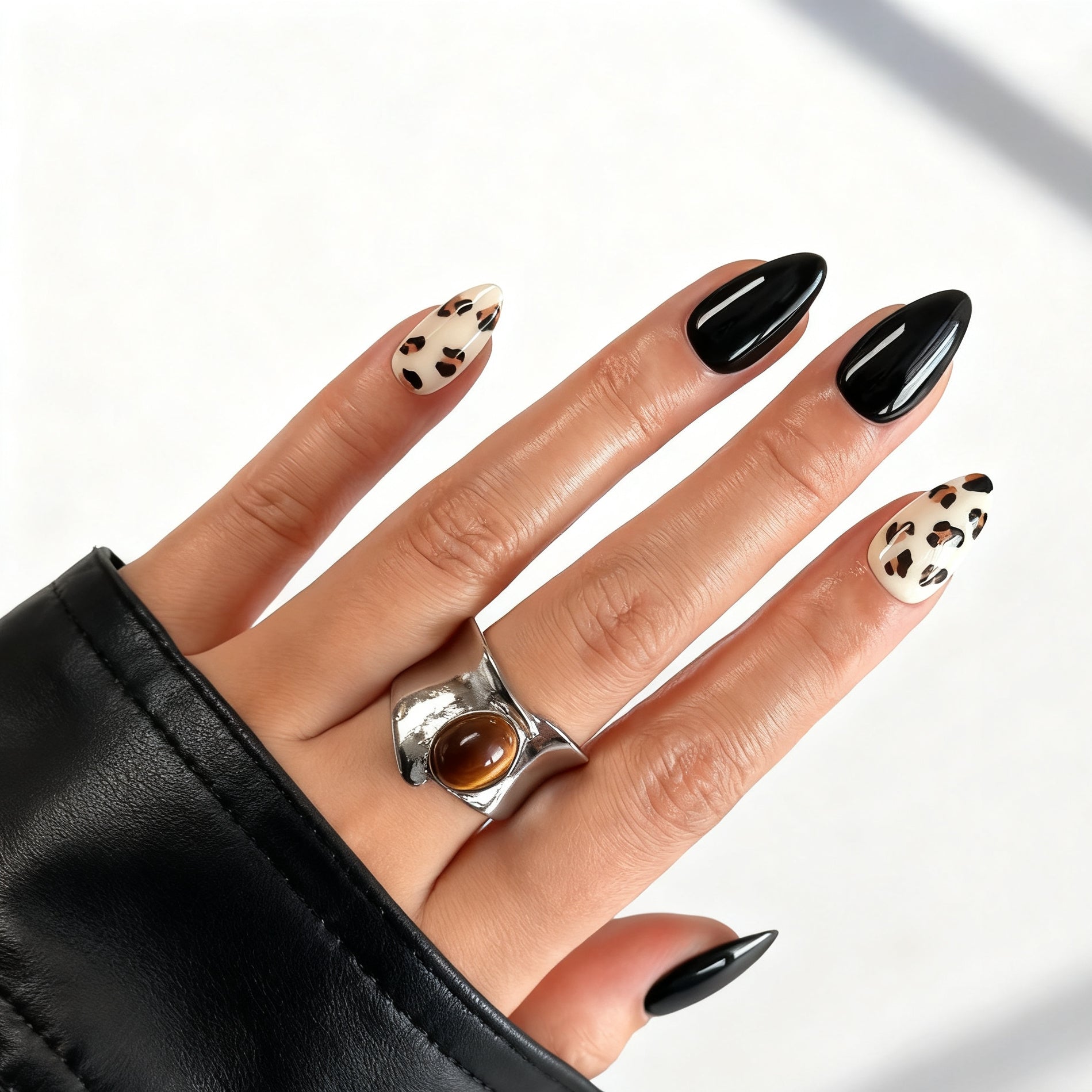 💅 Stylish and bold with glossy black nails paired with a subtle beige base featuring sleek leopard print accents
